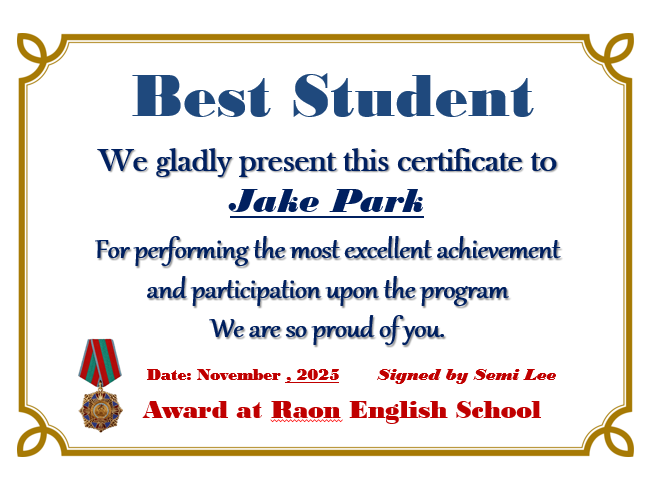 태전동, 장지동, 중대동 라온영어학원에서 2025년 11월 Best Student 소개해 드립니다.