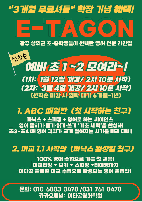 우리 예비 초1–예비 초2 친구들 요즘 영어, 어디까지 하고 있을까요? 이 시기의 영어는 무조건 많이, 빠르게 하는 게 정답은 아니에요. 아직은 천천히, 즐겁게 배우는 게 맞습니다. 하지만 한 가지는 꼭 지켜야 해요. 그냥 즐겁기만 해서는 안 된다는 것! 저학년 때 놀이처럼 즐기면서도 안에서 실력이 차곡차곡 쌓여야 4–6학년이 되었을 때 마치 고속도로를 달리듯 영어 실력이 확 올라갑니다 그래서 이타곤은 저학년 영어의 ‘속도’보다 기초의 밀도를 더 중요하게 생각합니다. ✔️ 차원이 다른 파닉스 시작반 ✔️ 파닉스를 마친 친구들을 위한 리얼 미국교과 수업 ✔️ “담임선생님이 한국인인지 미국인인지 헷갈려요” ....... <img src="https://blogthumb.pstatic.net/MjAyNTEyMjRfNjcg/MDAxNzY2NTQ0ODI1NTY2.T7bd2RnOPXZChHkd11QCDaydOvqgJcY6s0dJke6Wsr8g.2bFoJIkIYDvJlajQmrbHTLyX4rM4D1-W2lzVdZDVWXog.PNG/1766543244111.png?type=s3" />