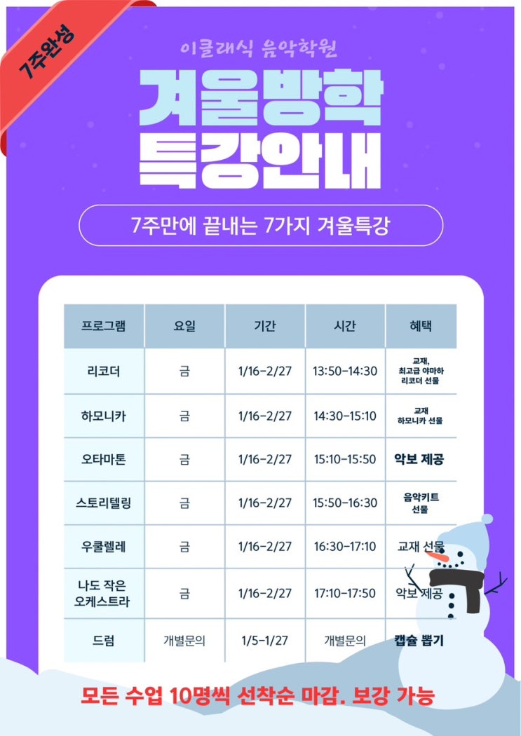 안녕하세요? 경기광주 대표 음악학원 꿈을 연주하는 꿈공간 이클래식 음악학원 이음부부원장입니다. 길고 긴 겨울 방학 동안 우리 아이들에게 유익한 시간을 만들어 주기 위해 이번 경기광주 겨울방학 특강도 알차게 준비했습니다. 끝까지 읽어보신다면 아이들에게 선물같은 특별한 방학을 선물해주시게 될겁니다. 7주 동안 7가지 악기 배우기 이클래식 다니는 친구들은 1가지 악기는 기본이죠? 최소 2~3가지 악기 이상씩은 다루는 우리 이음이들을 위해 이번 겨울 방학에는 또 어떤 새로운 악기를 가르쳐 줄지 많이 고민하며 준비했습니다. 총 7가지 악기를 7주 동안 배우게 됩니다. 경기광주 겨울방학 특강으로 이번에는 하모니카와 오타마톤이....... <img src="https://blogthumb.pstatic.net/MjAyNTEyMjdfMjg2/MDAxNzY2ODAwNTU4NzQ5.9a5vSFi-JoLhv6PZWWBPC42OSuDsdk3AA9drEKWjG1kg.FdIhqaQ0Ee4nKINKMPicbadknabUbzrO5BVIOs5Gexgg.JPEG/IMG%A3%DF7359.JPG?type=s3" />