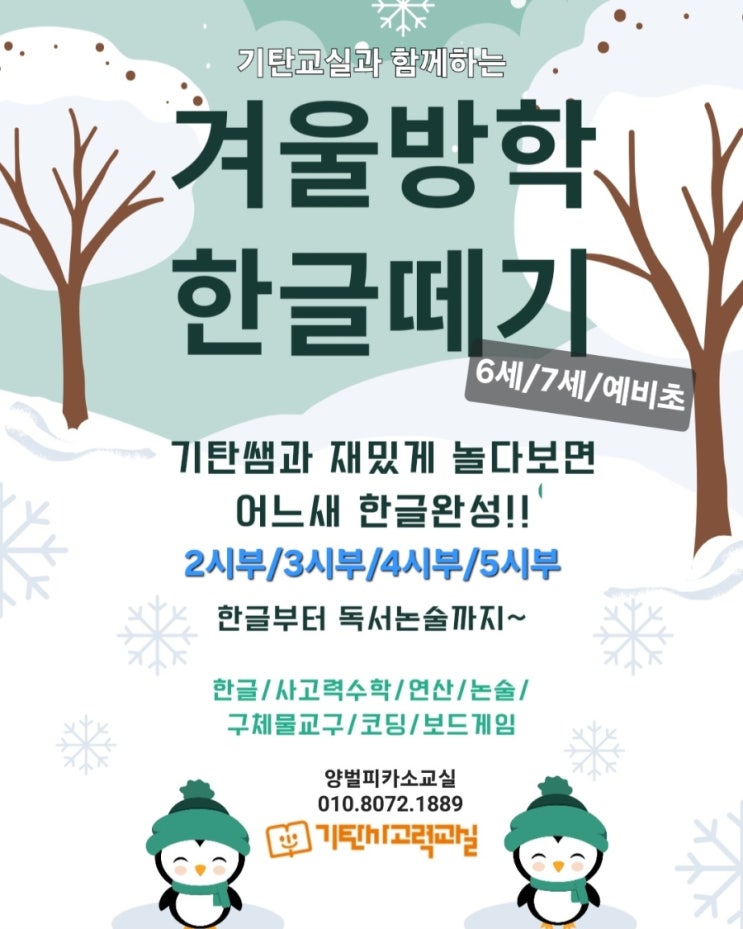안녕하세요~ 우리 아이들의 사고력을 쑥쑥 키워주는 기탄사고력교실 양벌피카소교실입니다. 벌써 차가운 바람이 부는 겨울이 찾아왔네요 . 겨울방학은 우리 아이들이 다음 학년을 준비하며 부족한 부분을 채우기에 가장 좋은 시기죠? 특히 예비 초등학생이나 한글이 서툰 6~7세 아이들을 둔 학부모님들이라면 이번 방학에 '한글만큼은 꼭 떼고 싶다'는 목표가 있으실 거예요^^ 그런 고민을 해결해 드리고자 양벌초 공부방의 중심, 저희 교실에서 특별한 겨울방학 프로그램을 준비했습니다! ❄️ 놀다 보면 완성되는 한글 공부! 억지로 외우는 공부는 이제 그만! 기탄사고력교실의 한글 수업은 기탄쌤과 즐겁게 놀다 보면 어느새 한....... <img src="https://blogthumb.pstatic.net/MjAyNTEyMjhfMTYw/MDAxNzY2OTI4NTEyOTE1.9RMzLuQTr0XfAJhE1kjfpSB_8KutR14KUl4WhTSIp6Yg.QsJi9JBSUKDC_SRy95Zj-DCTKP20F-YHEnan-sjbITwg.JPEG/900%A3%DF1766927965351.jpg?type=s3" />