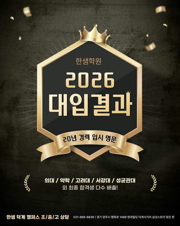 길었던 2026의 수시 입시가 마무리가 되었습니다 ! 이번 한샘학원의 대입 결과? 궁금하실 것 같아서 포스팅합니다:) 의학 계열 및 상위권 다수 합격 성과를 이뤘습니다. 이번 불수능으로 쉽지 않은 최저가 있었지만 꿋꿋하게 지켜왔습니다:) 아쉬웠던 고등학교 시절을 마무리하는 저희 학생들의 성과입니다:) 20년 입시 지도 경험을 바탕으로 학생별 목표 설정부터 전략설계, 끝까지 책임지는 밀착관리로 결과를 만들어냈습니다. 합격은 우연이 아닌, 철저한 과정의 결과입니다. 한샘 덕계캠퍼스는 계속해서 나아갈 것 입니다! 같이 나아가면 좋을 것 같습니다:) [상담문의] 031.868.8838 <img src="https://blogthumb.pstatic.net/MjAyNTEyMjNfMTM4/MDAxNzY2NDkwNTYzOTA3.5_VLQ3IMDc9AwOUNOSNiypWmM5EFtC7QB0mN2Aelirgg.xmXv83iSqvWLVE3dsbIWAdBZYziv8FidcmRDjBS7BhUg.JPEG/KakaoTalk_Photo_2025-12-23-20-33-13_001.jpeg?type=s3" />