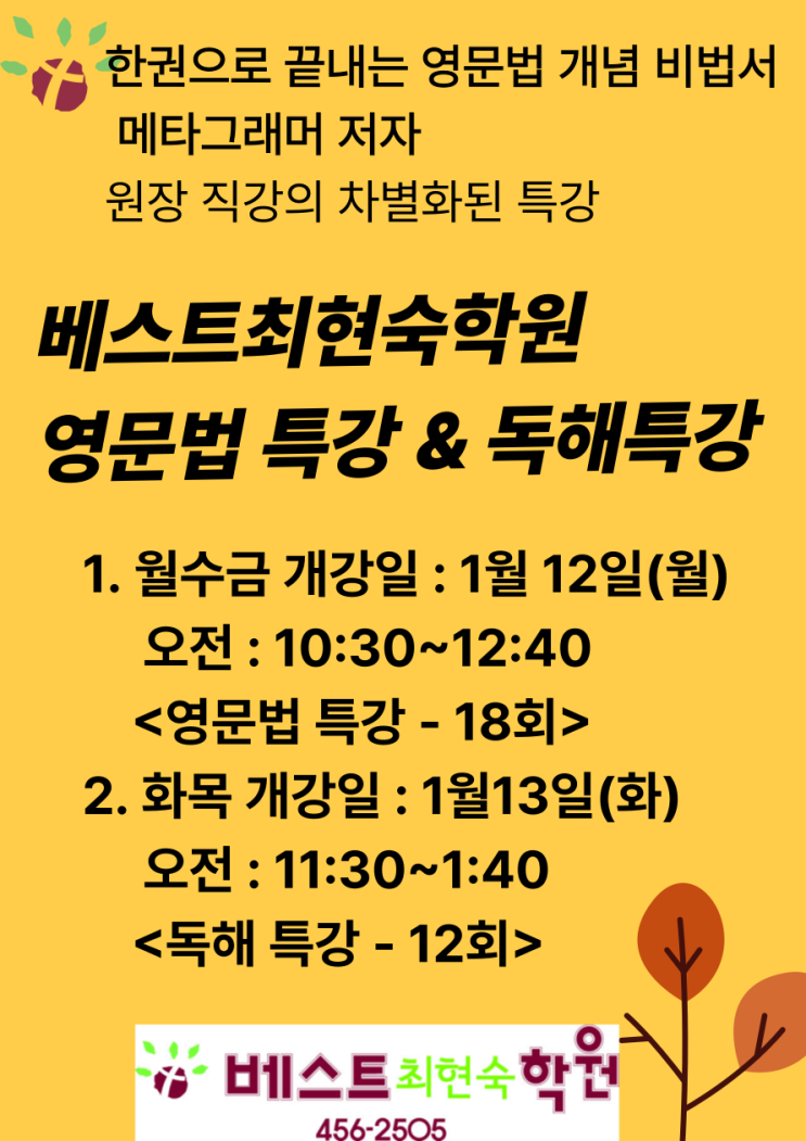 2026년 새 해가 밝았습니다. 새 학년을 맞이해야 할 새해가 밝다 보니 부모님들께서도 마음이 많이 분주하시죠? 예비고1 학생들이나 학부모님들께서는 지금 마음이 너무 많이 분주해 하고 계실 거라 여겨집니다. 고등학교에 가면 공부양도 많아지고, 문제가 어려워진다는 것을 알고 있지만, 학원을 믿고 맡길 수 밖에 없는 실정이라 생각합니다. 그래서 어떤 학원을 만나느냐는 굉장히 중요한 일입니다. 학원들마다 영문법 특강을 진행하고 있지만, 한 권으로 끝내는 영문법 개념 비법서 저자 베스트최현숙학원 원장이 직접 문법 특강을 진행합니다. 광장동영어학원구의동영어학원 광장동구의동에서 학원을 20년 째 운영 중입니다. 졸업생들이 인....... <img src="https://blogthumb.pstatic.net/MjAyNjAxMDFfMzgg/MDAxNzY3Mjc3MTg2ODQ2.7pIsagMonfpre3_13PvWtkqEYLqDUW3virycD-SezhUg.TCnSvl4vwArBT395YvT_Q_1saDr0wzmpI4s9Z3X82A0g.PNG/%C1%A6%B8%F1%C0%BB-%C0%D4%B7%C2%C7%D8%C1%D6%BC%BC%BF%E4_-001_%287%29.png?type=s3" />