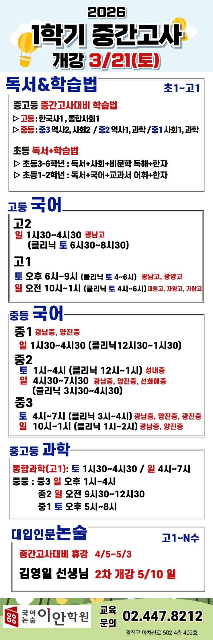 2026 중간고사 대비반 개강! 3/21(토)