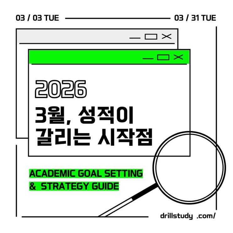 안녕하세요, 드릴스터디입니다. 3월이 시작되면서 학습 방향에 대해 고민하는 학생과 학부모님의 문의가 늘고 있습니다. “목표는 세웠는데, 어떻게 실천해야 할지 모르겠다”는 이야기를 가장 많이 듣습니다. 새 학기의 시작은 멀리 보는 계획보다, 지금 무엇을 해야 하는지 정확히 아는 것이 중요합니다. 현재 성적을 객관적으로 점검하고, 과목별 우선순위를 정한 뒤, 실천 가능한 계획으로 연결해야 합니다. 드릴스터디에서는 상담을 통해 학생의 공부 습관과 성적 흐름을 먼저 분석합니다. 그 후 내신과 수능을 함께 고려한 현실적인 학습 로드맵을 안내해드립니다. 막연한 목표가 아닌, 실행 가능한 계획으로 바꿔주는 과정입니다. 공부 시....... <img src="https://blogthumb.pstatic.net/MjAyNjAzMDNfMjc4/MDAxNzcyNTE0MDEzMDY1.Z1YdAdYHhirbLpE9JXkxY2Z3CMnx618TkLbZck2VQiAg.5Xl9TISkrPKLExqtmzBxGDF1JwxGCkdzLvcgU5dY7Zkg.JPEG/1.jpg?type=s3" />