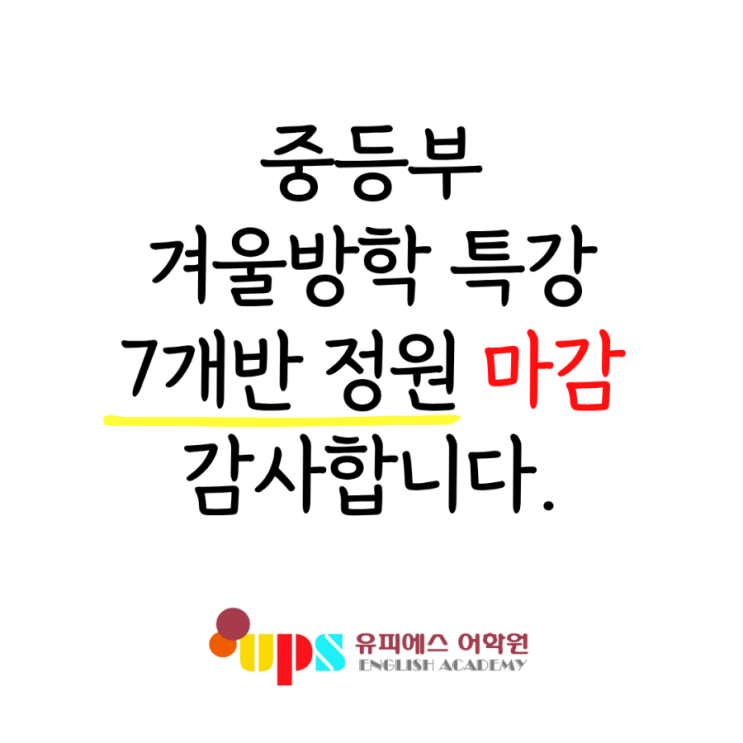안녕하세요. 유피에스어학원 입니다^^ 학습 격차가 더욱 커지고 있는 요즘, 겨울방학을 이용하여 더 높은 단계로 도약할 절호의 기회입니다. 유피에스어학원 중등부는 8주간 학년별,수준별 맞춤 영어특강을 준비했습니다. 예비중1 학생과 부모님들의 가장 큰 고민은 처음 마주하는 내신시험의 부담이 아닐까 합니다. 따라서 유피에스는 중1 내신시험에서 접하게 될 문법 내용과 2학기에 접하는 중1 교육과정에서 "가장 중요한 문법 내용" 인 "To부정사" 및 "동명사" 추가 공부를 위한 "자체 제작 교재"를 준비했습니다. 8주 동안 진행되는 강의 진행방식은 아래와 같습니다. [ 강의 진행방식 ] Step1 : ....... <img src="https://blogthumb.pstatic.net/MjAyNjAxMTVfMTY4/MDAxNzY4NDQ2MDU4Mzkx.r3tPJlu2vpbTFMVRKU4fK6yePozFLdElNYVuf9N-b_Ag.giDgf8nGPY38mJwhOy9S6m7b1ZsriEBKtANaOGkLyzkg.PNG/900%A3%DF%C1%A6%B8%F1%C0%BB_%C0%D4%B7%C2%C7%D8%C1%D6%BC%BC%BF%E4.%A3%AD10.png?type=s3" />