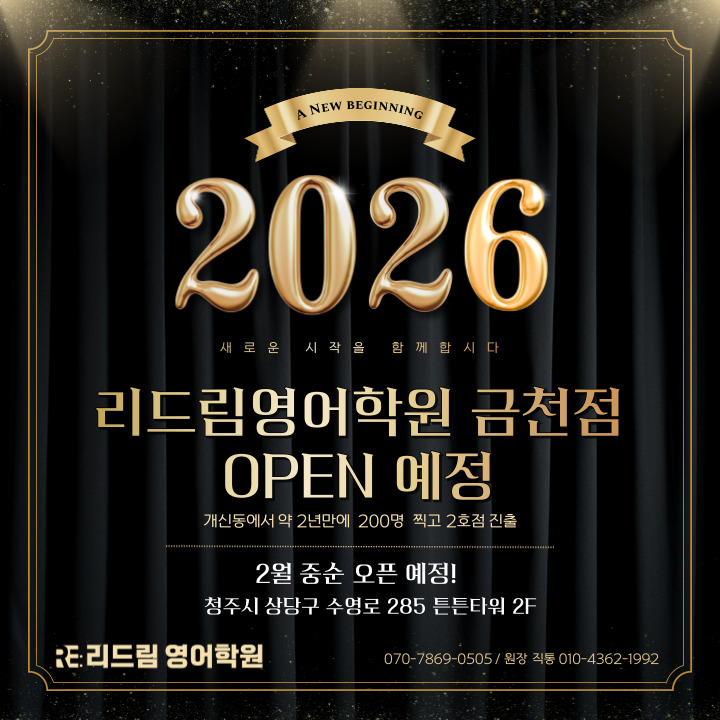 안녕하세요. 리드림영어학원 대표원장 김희서입니다. 2023년 11월 개신동에서 출발한 리드림은 학부모님과 학생들의 만족도를 높이기 위해 항상 고민했습니다. 성적향상은 기본이며, 어떻게 해야 학생들이 리드림을 즐겁게 등원할 수 있는 곳으로 만들지, 상위권이든 하위권이든 모든 학생들이 만족할 수 있는 학원이 되고 싶었습니다. 개신 본원에서는 성적향상 뿐만아니라 학생들이 오고 싶어하는 학원으로 단기간 안에 성장시켰습니다. 영어를 힘들어하는 우리 학생들을 위해 리드림 영어학원은 빠르게 2호점 오픈 준비에 나설 예정입니다. . . . 2월 중순, 리드림영어학원을 금천점에서도 만나보실 수 있습니다. 상담문의 070-7869-0505 원장....... <img src="https://blogthumb.pstatic.net/MjAyNjAxMTZfNzUg/MDAxNzY4NTU4NzI1Mzg4.OJYazHr0vERSrFrEQLM8gaSMR1hm4_BgWn4Gg1S4ryog.RiPJFRBILu4QLChaDjysXZ966LmMmN3sQmr19x-Igpkg.JPEG/001.jpg?type=s3" />