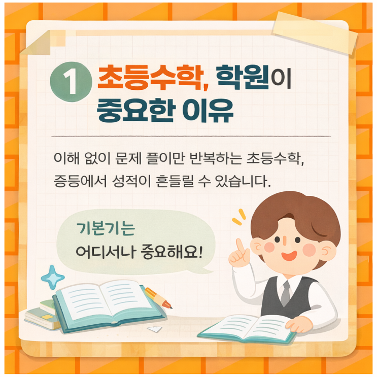 1. 초등수학, 학원이 중요한 이유 초등수학은 단순한 계산 연습의 시기가 아닙니다. 이 시기에는 수학을 ‘이해하는 힘’을 만드는 것이 핵심입니다. 하지만 많은 아이들이 문제 풀이만 반복하며 기초를 놓치고 있습니다. 이 상태로 중등에 올라가면 성적이 흔들리는 것은 당연한 결과입니다. 초등에서 만들어진 기본기가 결국 중고등 수학의 성패를 좌우하게 됩니다. 그래서 초등수학은 어디서, 어떻게 배우느냐가 매우 중요합니다. 2. 선행이 답일까요? 많은 학부모님들이 “선행을 해야 한다”는 불안감을 느끼십니다. 물론 일정 수준의 선행은 필요합니다. 하지만 이해 없이 속도만 빠른 선행은 오히려 독이 됩니다. 진도는 앞서가는데 아이....... <img src="https://blogthumb.pstatic.net/MjAyNjAzMjRfNTYg/MDAxNzc0MzIwNjA0NzMy.Fr1iea4_fkY-REZos-_wz9eZJ7cIftXbArsqLNFNCyMg.a0lPIxL-Kezdhx5HYp2cCPodybz5gBWENocI_q6MSAcg.PNG/%C3%CA%B5%EE%BC%F6%C7%D0_%C7%D0%BF%F8%C0%C7_%C1%DF%BF%E4%BC%BA.png?type=s3" />