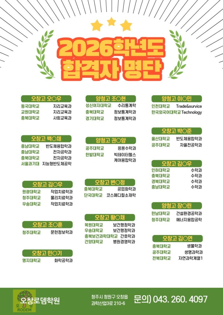 안녕하세요, 오창로뎀학원입니다 드디어 기다리던 2026학년도 대학 입시 결과가 모두 마무리되었습니다. 올해도 오창로뎀학원 학생들이 각자의 자리에서 값진 결실을 맺었습니다. 한 문제, 한 단원씩 묵묵히 쌓아온 시간들. 그 과정 속에서 포기하지 않고 끝까지 달려준 우리 학생들, 그리고 믿고 맡겨주신 학부모님들께 진심으로 감사드립니다. 오창로뎀학원, 올해도 입시 결과로 말합니다 이번 입시에서 오창로뎀학원은 사범대, 공대, 자연계열, 보건계열, 상경계열 등 다양한 분야에서 합격 소식을 전할 수 있었습니다. 특히 눈에 띄는 점은 ✔ 특정 상위권 몇 명의 결과가 아닌 ✔ 여러 학교, 다양한 전공으로의 고른 합격이라는 점....... <img src="https://blogthumb.pstatic.net/MjAyNjAxMzFfMTAz/MDAxNzY5ODMyNTQzMDcw.GI5-Khm2eQ_9WXeQrreBFF-Y-GmwgcAKFf6PK77O67Ag.nPQCewOxAo7fbZBNUdp0X_5J-fFV9P2ENntv_ofXru8g.JPEG/%C1%A6%B8%F1%C0%BB_%C0%D4%B7%C2%C7%D8%C1%D6%BC%BC%BF%E4._%284%29.jpg?type=s3" />
