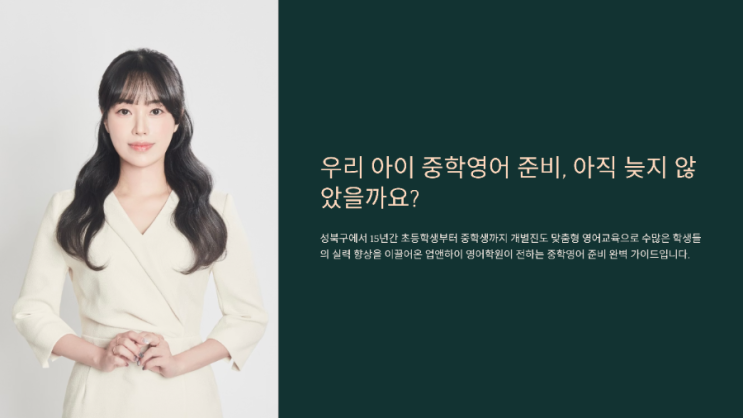 "선생님, 우리 아이 아직 중학교 영어 준비를 못했는데 어떻게 하죠?" 성북구에서 15년간 초등학생부터 중학생까지 개별진도 맞춤형 영어교육으로 수많은 학생들의 실력 향상을 이끌어온 업앤하이 영어학원 원장으로서, 매년 이맘때쯤이면 가장 많이 받는 질문입니다. 오늘은 실제 교육 데이터와 학생 사례를 바탕으로, 초등 6학년이 중학영어를 쉽고 재밌게, 그러면서도 정확하게 준비하는 방법을 말씀드리겠습니다. 초등영어와 중학영어, 무엇이 다를까요? 초등영어가 영어를 처음 접하고 재미있게 배우는 과정이었다면, 중학영어는 시험을 잘 보기 위한 본격적인 학습이 시작되는 시기입니다. 단순히 재미만을 위한 영어를 넘어, 어....... <img src="https://blogthumb.pstatic.net/MjAyNjAxMTFfMjg0/MDAxNzY4MTA0MjY5NjU2.vq3lLq7JtXnD_Rt3dlweT2kVd3bzpu2Jkkw5xTVUoq4g.E4Jf1bMNugzQW4l2iu-eyOZD8kIwxwnPByUJzcgaDv4g.PNG/900%A3%DF1768104243920.png?type=s3" />
