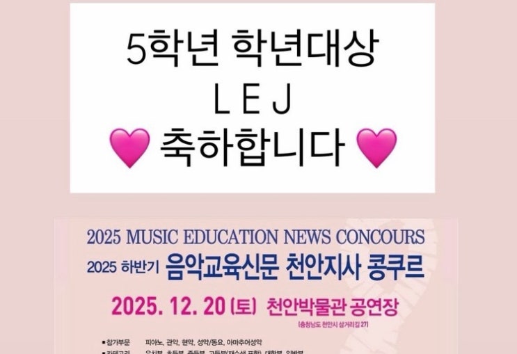 콩쿨 입상 소식입니다. 수강생 LEJ 기본기가 많이 부족한 상태로 스튜디오에 왔었던 학생입니다. sight reading도 느린 편이었고 자세와 손모양 등 손 볼 것이 많았었죠. 선화예중을 목표로 왔던 친구인데요. 점점 끌어주는대로 잘 따라왔습니다. 악보보는 실력이 빨라지고 늘었고, 손 끝에 힘이 더 생기기 시작하더니 바하 신포니아를 포함 많은 난이도 있는 클래식 곡을 열심히 익히고 있던 중에 - 준비해 나간 콩쿨에서 학년대상 받아왔습니다. 축하합니다 ! ♥️ 또한, 우리 스튜디오 오픈 초창기 멤버 중 한명인 KJY 수강생은 피아노에 대한 열정이 풍부하고, 듣는 귀가 참 많이 발달된 학생입니다. 이번 음악교육신문 콩쿨에서 2등을 했네....... <img src="https://blogthumb.pstatic.net/MjAyNjAxMTJfMjU0/MDAxNzY4MjAzNTcwNTA0.V7YQRdSGlwYf32jjJm0As_AETg9o-ccKIiQtrEGi5Egg.pYy_SSK5wYTM0EDPEgDsRmGM2ET2EWjbBr22KSWwSTwg.JPEG/output_507821121.jpg?type=s3" />