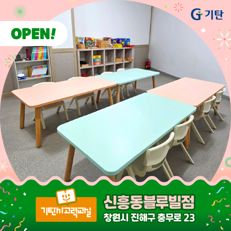 아이의 ‘공부 자신감’을 키워주는 공간! 창원시 신흥동에 기탄공부방이 새롭게 오픈했습니다. 창원시 신흥동에 아이의 학습 습관을 차근차근 만들어주는 기탄공부방 신흥동교실이 새롭게 문을 열었습니다. 처음 아이를 공부방에 보내려 할 때 부모님들은 비슷한 고민을 하게 됩니다. “우리 아이에게 너무 빠르진 않을까?” “공부에 대한 부담을 먼저 느끼진 않을까?” “아이를 가르칠 때 조금 더 세심하게 봐주는 곳이었으면 좋겠어” 신흥동 기탄공부방은 이러한 부모님들의 마음을 알고 있습니다. 그래서 아이 한 명 한 명을 진심으로 대하며 교육을 진행 합니다. 아이마다 '공부 속도’는 다릅니다. 신흥동 기탄공부방의 가장 큰 특....... <img src="https://blogthumb.pstatic.net/MjAyNjAxMTNfMTIx/MDAxNzY4Mjk0MTQxMzIw.abilyUSfQz4nCOKLilsOduwxpWlFXRlREPCUMGuO3RYg.kZ8tq2y4SsCs7eX4UP83evRzLvsExwl-E4nTmHN0FUIg.PNG/2601_07_%C1%A4%B9%E6%C7%FC_%BD%C5%C8%EF%B5%BF%BA%ED%B7%E7%BA%F4%C1%A1.png?type=s3" />