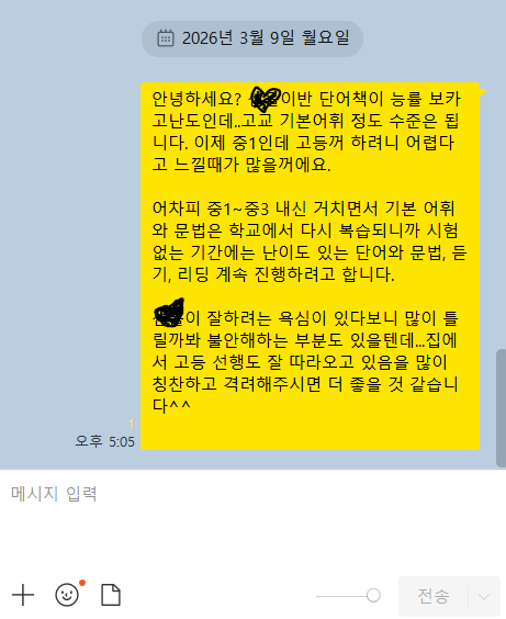 안녕하세요? 노원 중계동 은행사거리에서 황혜정 영어학원을 운영하는 황혜정 원장입니다. 본원에서는 일주일간 진행한 영어단어 테스트 오답을 모아 일요일에 학생들 카톡으로 발송하고 있습니다. 복습을 더 확실하게 시키기 위해 지난주부터 영어단어 시험 오답복습 방식을 바꿨습니다. 단어와 뜻을 모두 주지 않고 직접 단어책을 찾아서 뜻을 적도록 오답 숙제를 내주는 방식으로요~ 중계동 영어학원장의 고민 “영어단어 어떻게 하면 잘 외우게 할 수 있을까?” 중계동에서 중학생들을 가르치다 보면 학원장으로서 늘 고민하게 되는 부분이 있습니다. 바로 영어단어 암기입니다. 요즘 많은 초등, 중학생들이 영어단어 암기를 거부합니다. 제....... <img src="https://blogthumb.pstatic.net/MjAyNjAzMTFfMTIy/MDAxNzczMTk3MTk5NDYw.3AhjdSdus42BTUdariibx32zRwIH9MaoJxajK1s1bwgg.ZlL3lGHv51xaVKCek2b6vIg5h7WPiQLwOAs-sjes_EIg.PNG/%BC%D2%C5%EB.png?type=s3" />