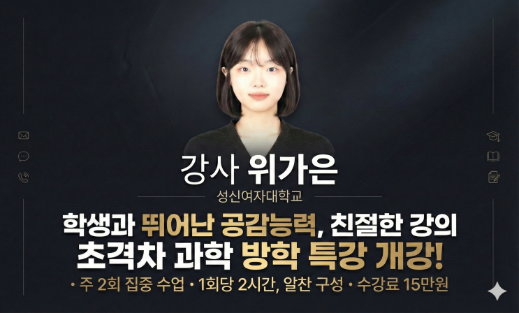 제목: 고등 내신으로 증명된 강의, 이제 중등/예비고1과 만납니다. 결과는 속일 수 없습니다. 이미 고등부 내신 성적으로 실력을 확인하신 그 선생님이 이번에 중등부와 예비고1을 위한 특강을 시작합니다. 어렵게 돌아가지 마세요. 고등학교에 올라가서 바로 통하는 공부법, 선배들이 경험한 그 확실한 길을 그대로 전해드립니다. 모집 대상: 중등 전 학년 및 예비고1 <img src="https://blogthumb.pstatic.net/MjAyNjAxMDVfMTE3/MDAxNzY3NTkxMzYwODc3.VFZDon8oqaFPj-tqwJylCJz3hQFmkSGtHonbektiMogg.tQzy0YJm8gKv1fNvoRmM2LkomTauoZaicj_5Z75_668g.PNG/KakaoTalk_20251228_192450889.png?type=s3" />
