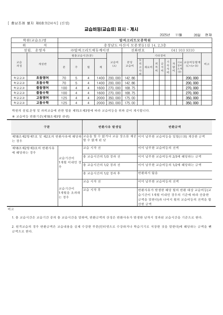 [공지]탑씨크리트 2025년 12월 모종원 교습비 안내