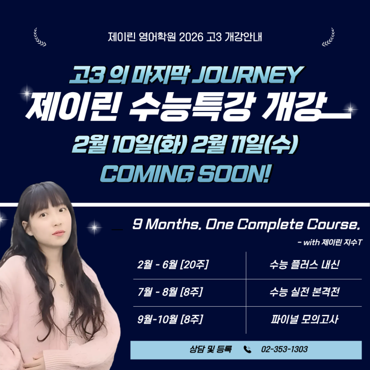 은평구 영어학원 고3 내신대비 수능특강반 개강 (ft. 2월 10일) 고3이 되는 순간, 공부의 기준은 달라집니다. 이제 중요한 것은 얼마나 오래 붙잡고 있느냐가 아니라, 수능까지 어떻게 끌고 가느냐입니다. 제이린 영어학원은 2026학년도 고3을 위한 수능특강 전 과정 커리큘럼을 준비했습니다. ✔ 2월부터 수능까지 이어지는 9개월 완주 구조 ✔ 진도 공백 없이 설계된 단계별 로드맵 ✔ 수능과 내신을 동시에 책임지는 고3 전용 시스템 개강 안내 2월 시간표 화·목반 : 2월 10일(화) | 수·금반 : 2월 11일(수) 본 수업은 예비 고3만을 대상으로 운영되는 전용반으로, 개강과 동시에 빠른 진도로 수업이 진행됩니다. 이에 따라 모집은 2월 6....... <img src="https://blogthumb.pstatic.net/MjAyNjAxMTRfMTA2/MDAxNzY4Mzg4OTk3NDAx.hCz8UKxO6nG5aYvqEkMLRHyEUIQsJaRpA8YbhAZNADwg.FSaIUFLeDmOqT9sQ2DOecFAY31RdB9vrBetcZm5M8a8g.PNG/1.png?type=s3" />