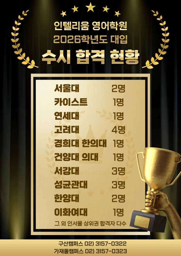 안녕하세요. 인텔리움 영어학원입니다. 2026학년도 대입 수시 전형에서 서울대, KAIST를 포함한 주요 대학 합격 소식을 전해드립니다. 긴 시간 동안 대입을 준비해온 수험생 여러분 정말 고생 많았습니다. 또한 옆에서 묵묵히 응원해주신 학부모님들께도 진심으로 감사의 말씀을 전합니다. 합격자 여러분께 축하의 말씀을 전하며 추가 합격 소식이 있는 경우 추후 다시 안내드리겠습니다. 앞으로도 인텔리움 영어학원은 학생 개개인의 학습 과정을 바탕으로 학생별 목표에 맞춘 지도를 이어가겠습니다. 감사합니다. <img src="https://blogthumb.pstatic.net/MjAyNTEyMjlfMTg4/MDAxNzY3MDEyMjk3MTgy.TkF9POO4ek_3g40sU39N7sLLSB29sSY65e_ilPpoJyAg.YOv3GSFtxEoCQ-YkmOi2pEKrkQCzJBSlxBLkvdnGXtQg.JPEG/2026%C7%D0%B3%E2%B5%B5_%BC%F6%BD%C3%C7%D5%B0%DD%C7%F6%C8%B2.jpg?type=s3" />