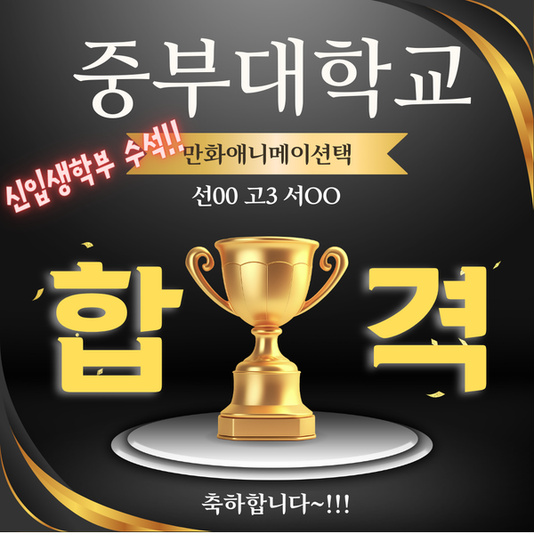 은평 창조의아침 애니반에서 2026학년도 입시에서 놀라운 소식을 전해드립니다. 중부대학교 만화애니메이션학과에 저희 학생들이 수석과 차석으로 동시 합격하는 놀라운 성과를 이루어냈습니다. 특성화고 졸업자 전형으로 지원하여, 실기뿐 아니라 철저한 내신 관리와 꾸준한 열정으로 이뤄낸 값진 결과입니다. 중부대학교 만화애니메이션학과는 실무 중심 교육과 프로젝트 기반 수업으로 유명한 학과입니다. 애니메이션, 웹툰, 게임콘텐츠 등 다양한 분야의 창작 역량을 기를 수 있도록 체계적인 커리큘럼을 운영하고 있으며, 전공 교수진 역시 현업 경험이 풍부한 전문가들로 구성되어 있어 현장감 있는 수업이 이루어집니다. 또한 장학 혜택과....... <img src="https://blogthumb.pstatic.net/MjAyNTEyMjlfMjQw/MDAxNzY2OTQ4NzUwOTUy.xt9HVdlOBql7_JOlpJR6vg9uiiNxUnRgKzf78bQ1y-Yg.98jGLXThRURsTi1MBnIH8tHOHnJPThTGf-Mb7YA_T8Mg.PNG/4.png?type=s3" />