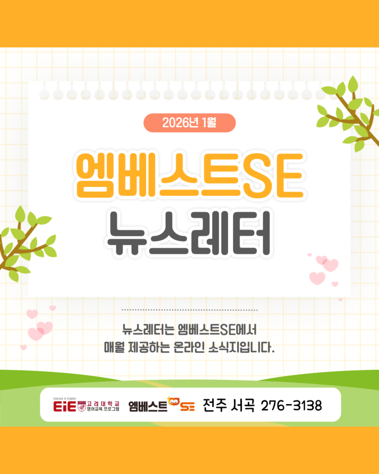 Well begun is half done! 좋은 시작은 절반은 성공한 걸 의미하지요^^ 2026년 초등부 기초반 개강합니다! 미국 원어민 선생님과 기초부터 즐겁게 천천히 제대로 성장할 수 있는 기회를 꼭 놓치지 마세요! 영어로만 진행되는 수업이 처음에는 어색할 수 있지만 매일 웃으며 하이파이브 하는 시간이 쌓여 어느새 자신감이 쑥쑥 올라갈거예요~~!! 자세한 수업관련 문의 및 상담 ⏩️ 010.2663.2515 도일 T #전주영어학원 #전주초등영어 #전주원어민영어 #파닉스기초반 #수잔영어 #중화산동 #전주한들초 #전주우전초 #전주문학초 #전주새연초 #전주코오롱하늘채 #전주에코르 #전주포스코 #전주서부신시....... <img src="https://blogthumb.pstatic.net/MjAyNTEyMzFfMjE1/MDAxNzY3MTQ1OTQ5NzE0.PgNXf1fgfXlgnvp-LhgC9GTaci0jjqrLisbxFNoYRo0g.WXhLbrNQge99asteXklGIewUC-zuMecjA6GZgRM52REg.PNG/%C1%A6%B8%F1%C0%BB_%C0%D4%B7%C2%C7%D8%C1%D6%BC%BC%BF%E4%A3%AD6.png?type=s3" />