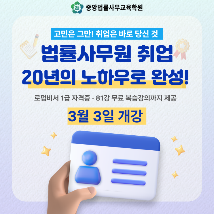 취업, 더 미루지 마세요. 준비된 곳에서 시작하면 결과가 달라집니다. 법률사무원 취업, 20년 노하우로 체계적으로 완성 3월 3일 개강 수강문의 02-525-1007 <img src="https://blogthumb.pstatic.net/MjAyNjAxMTNfMjE3/MDAxNzY4MjkyNDk1MDc2.8OdtucPQLu6PUvCFAGPettR44l4xlXP-lFc0b076naEg.9OSmxTxWSDKtO94MqLMrGmmw_80sseruKQ4F56M6KIgg.PNG/20260113-3%BF%F9_3%C0%CF_%B0%B3%B0%AD.png?type=s3" />