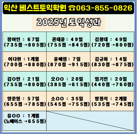 [익산토익학원] 베스트토익 2025년 한 해 동안의 점수결과 모음 및 1월 9일 모의토익 결과 베스트토익과 함께하면 처음에는 400~500점대라 할 지라도, 600~700점대라 할 지라도, 2개월 안에700~800으로, 800 ~ 900 이상으로 토익점수가 수직 상승하게 됩니다. 아래의 점수들처럼 말이죠. <2025년 한 해 동안의 점수결과> <2018년 8월 ~ 2025년 11월 점수결과 모음> 여러분들은 어떤 점수를 얻고 싶으신가요? 황금같은 이 겨울방학기간을 그냥 보내지 마시고, 항상 정도를 가며 점수를 잘 올리고 있는 베스트토익에 오셔서 원하는 토익점수 2개월 안에 얻어보시기 바랍니다. 토익이 인생의 전부는 아니지만, 목표점수를 얻게되면 너무....... <img src="https://blogthumb.pstatic.net/MjAyNjAxMTJfMjgx/MDAxNzY4MjIwNTY2ODgw.4aPLcYocMeNJ4Xmz0Frh2S4GGMA240toiNOm6-1a-AQg.EzdKzA4A_9Fq6MFyqYkW2m8PIlO4o2we3XpoZXNg8AUg.PNG/qwe.png?type=s3" />