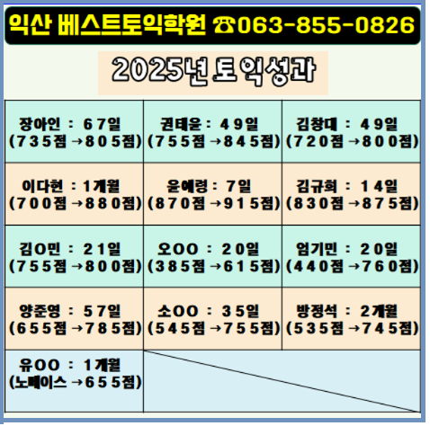 [익산토익학원] 베스트토익 2025년 한 해 동안의 점수결과 및 문장 구조 분석 베스트토익과 함께하면 이해와 설득의 수업으로, 아래의 점수결과들처럼 토익점수가 수직 상승하게 됩니다. <2025년 한 해 동안의 점수결과 모음> <2018년 8월 ~ 2025년 11월 점수결과> 현재 베스트토익의 정규진도가 순조롭게 진행되고 있습니다. 우리 학생들이 열심히 공부를 해오기 때문에 이해도도 높고, 모르는 것들은 언제든지 물어봐서 바로 바로 알아가기 때문입니다. 이렇게 열심히 하는 학원생들이라 1월 마지막에 볼 두번째 모의토익 점수가 기대되고, 정기토익 시험 또한 기대됩니다. 학원생들 모두 최대의 성과를 올릴 수 있도록, 열정을 다....... <img src="https://blogthumb.pstatic.net/MjAyNjAxMTVfMjcy/MDAxNzY4NDYxNzE1MTIy.ZaxlBPtnkTspQxo2LAv4TWaD4w-JG6ZYj73a8nv8gB0g.LARLPAhWGd4OcHPDqjdY9EAlEmxFD8I7wv1d4QCQ51Mg.PNG/2025%B3%E2_%B0%E1%B0%FA_%B4%EB%B9%DA.png?type=s3" />