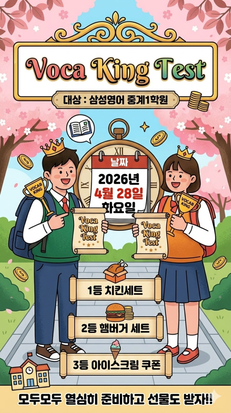 드드디어 돌아온 삼성영어 중계1학의 빅 이벤트! 우리 아이 영어 실력도 쑥쑥, 맛있는 간식은 덤! 'Voca King Test' 가 열립니다! 단어왕이 되기 위해 열심히 준비할 우리 아이들을 위해 푸짐한 상품을 준비했어요. 모두모두 열심히 준비해서 영광의 'Voca King' 상장과 함께 맛있는 선물까지 몽땅 챙겨가세요! • 일시: 2026년 4월 28일 화요일 • 대상: 삼성영어 중계1학원 학생 전체 • 시상 내역: • 1등: 치킨 세트 (우와!) • 2등: 햄버거 세트 • 3등: 아이스크림 쿠폰 지금부터 단어 공부 시작~! 이번 보카킹은 바로 너! 시스템이 좋은 학원 종로엠....... <img src="https://blogthumb.pstatic.net/MjAyNjA0MDNfMTQw/MDAxNzc1MjExNTk4OTU3.auoLgP8vZgtsuB_sGQnXiuMg2l6WXGtBW53Bg17IJB4g.ax5PbOoHXh7br14Fm9VYNPvcSzJAGQakLAsABaKAUfAg.JPEG/1.jpg?type=s3" />
