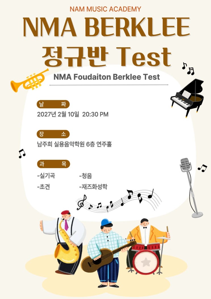 안녕하세요 남주희실용음악학원입니다:) 2026년 2월 10일 (화) 저희 NMA에서 NMA 버클리 정규반 Test 가 진행될 예정입니다. 이번에 진행되는 NMA 버클리 정규반 테스트는 버클리 음대 진학을 희망한다면 누구나 참여할 수 있는 테스트이며 이번 테스트에는 NMA Foundaton Berklee 학생들도 시험을 치를 예정입니다. NMA Foundation Berklee 반 NMA 버클리 정규반 커리큘럼에 어려움 없이 적응할 수 있도록 정규반 진학하기 전에 이론, 청음, 실기 등 전반적인 기본기를 체계적으로 배우고 보완할 수 있는 반입니다. NMA Berklee 정규반 Test ✍️ 이번 2월 10일 진행될 예정인 NMA 버클리 정규반 Test에선 다양한 과목으로 세분화되어 시....... <img src="https://blogthumb.pstatic.net/MjAyNjAxMTlfMTQ3/MDAxNzY4ODIzMDg5OTQy.cyacoW2x6hZ9ujJthPKuhpdsDmasTKSeyV2skJdRyGkg.5RJRhRFPSL-M2UtVVPhJRcIMgQOOkvp8qC8nHxyHJk0g.JPEG/3%BF%F9_%B9%F6%C5%AC%B8%AE_%C1%A4%B1%D4%B9%DD_%C5%D7%BD%BA%C6%AE.jpg?type=s3" />