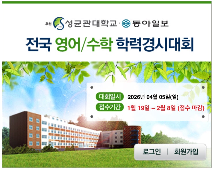 2026년 전기 제51회 전국 초중고 영어/수학 학력경시대회 [후원] 성균관대학교, 동아일보 ♣ 시험일시 ♣ 4월 5일(일) [수학] 1시 ~ 2시 30분(90분) [영어] 3시 30분 ~ 4시 40분(70분) ※ 영어 또는 수학 1과목 응시 가능 ♣ 접수기간 ♣ 1월 19일(월)부터 (접수마감 홈페이지 참조) ♣ 참가대상 ♣ [수학] 초1~고3 [영어] 초3~고3 ※ 초1,초2는 초3영어부터 응시가능 ※ 2026학년도 3월 기준 학년으로 응시 ♣ 접수방법 ♣ ① 온라인접수(PC/모바일) ② 전국 지정접수처 방문접수 ③ 우편접수(단체접수) ☞ 시험 접수 바로가기 https://test.edusky.co.kr/m/ ♣ 고사장 ♣ 성균관대학교 및 전국 지역별 고사장 (※ 고사장별로 선착순 마감) ☞ 고....... <img src="https://blogthumb.pstatic.net/MjAyNjAxMTZfMjc1/MDAxNzY4NTI5MzUwMDEy.R-jyj-EB1HhmCFRhSs0pTR-YlBxswTJp4NjAttYeMsIg.aRMOJonK2p87xMi1LjDePJmq1qye_xjSORmjeI2udRMg.JPEG/260116_%BC%BA%B4%EB%B0%E6%BD%C3_MO_%B8%DE%C0%CE_%BA%ED%B7%CE%B1%D7.jpg?type=s3" />