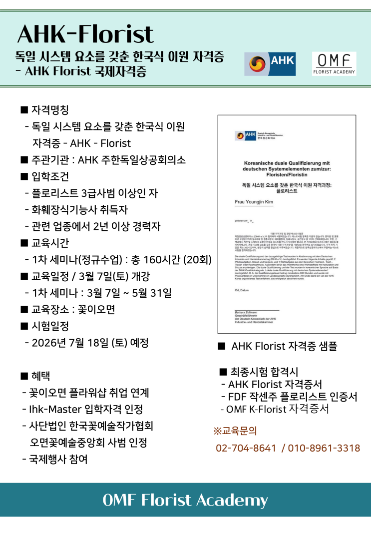 안녕하세요. 꽃이오면 학원 입니다. 오늘은 AHK 플로리스트 자격시험 주말반 개강 소식을 전해드립니다. AHK 플로리스트 자격증이란?? 독일연방상공회의소(DIHK)가 승인하고, 한독상공회의소(AHK)에서 발급하는 자격증으로 직업교육에 대한 DIHK의 Quality-Category 기준의 과정과 테스트를 거쳐 발급 됩니다. DIHK의 Quality-Category는 전세계 AHK에서 동등하교 통용 됩니다. 꽃이오면 학원은 주한독일상공회의소와 함께 협업하여, AHK 플로리스트 자격과정을 운영하고 있습니다. 이번 AHK플로리스트 자격 과정 주말반은 3월 7일 개강하여 5월 31일까지 매주 토요일 총 20회 수업으로 진행 됩니다. 아래 이미지를 클릭 하시면 주한독일상공회의....... <img src="https://blogthumb.pstatic.net/MjAyNjAxMTZfODgg/MDAxNzY4NTI5NjMwODIw.WevkxX8aMmYElZoDWHjwbsSf6R14S_yA3Bxnj47K_hMg.5opkBBV6fWK4C7_X_bsS2rSwAV6BH6V9WS3pIhY2-v8g.PNG/2026%B3%E2_3%BF%F9_7%C0%CF_%C1%D6%B8%BB%B9%DD_%B0%B3%B0%AD_%BE%C8%B3%BB_%28A4%29.png?type=s3" />