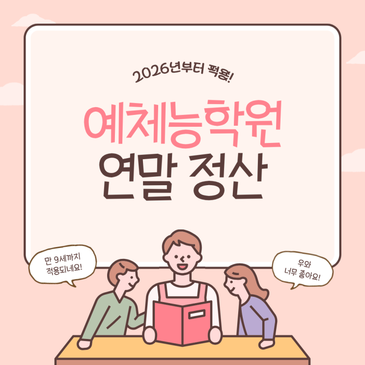 아현동 아동미술학원 플로아트입니다. 2026년부터 좋은 소식을 있어서 빠르게 소식 전하고자 합니다. 그동안 예체능 학원비는 유치원, 어린이집까지만 공제되고, 초등학교 입학하는 순간 혜택이 끊겨 아쉬움이 컸는데요. 2026년부터 제도가 바뀝니다. 초등학교 1~2학년(저학년) 자녀의 예체능 학원비도 교육비 세액공제 대상에 포함됩니다. 예체능 학원비 공제, 뭐가 달라졌나요? 기존 제도 취학전 아동(유치원, 어린이집) 예체능 학원비만 공제가능 초등학교 입학 후에는 예체능 학원비 공제x 2026년부터 변경 초등 1~2학년(만9세 미만) 자녀의 예체능 학원비도 교육비 세액공제 가능 학부모님 입장에서는 아이가 학교 적응하는 시기에 예체능 교....... <img src="https://blogthumb.pstatic.net/MjAyNjAxMjFfNCAg/MDAxNzY4OTgyMzM4NzA5.rN5J0_hAFSzCZCbXwWaLvfRmFncNZvtX-a-hr0jsqXQg.jFasVz_Wl5hCHlkaWwWOjtpjMhyTSvf0BDpd6XBpHJ4g.PNG/%C1%A6%B8%F1%C0%BB_%C0%D4%B7%C2%C7%D8%C1%D6%BC%BC%BF%E4._-_2026-01-21T165558.391.png?type=s3" />