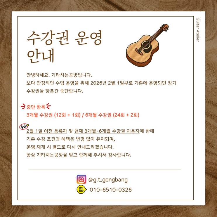 수강권 운영 안내 안녕하세요, 기타치는공방입니다. 항상 공방을 아껴주시고 함께해 주셔서 진심으로 감사합니다. 보다 안정적인 수업 운영과 수업의 흐름을 지키기 위해 2026년 2월 1일부터 기존에 운영해오던 장기 수강권을 당분간 중단하게 되었습니다. 중단되는 수강권 안내 3개월 수강권 (12회 + 1회) 6개월 수강권 (24회 + 2회) 다만, 2월 1일 이전에 등록을 완료하신 분들, 또는 현재 3개월·6개월 수강권을 이용 중이신 분들께서는 기존 수강 조건과 혜택을 변경 없이 그대로 적용받으실 수 있으니 걱정하지 않으셔도 됩니다. 장기 수강권 운영 재개 여부는 추후 상황에 맞춰 다시 한 번 안내드리겠습니다. 앞으로도 한 분 한 분의 수....... <img src="https://blogthumb.pstatic.net/MjAyNjAxMTJfMjMy/MDAxNzY4MTkwMTY1MDAw.RQROIr2S8C05uRJ405aiWxKwdptDQIOJh0AaHniGjMkg.T_W_95lsqx6Dj7X2Qo7gLcE9P1JOGuKZsB7JRpK-kX4g.JPEG/%C1%A6%B8%F1%C0%BB_%C0%D4%B7%C2%C7%D8%C1%D6%BC%BC%BF%E4..jpg?type=s3" />