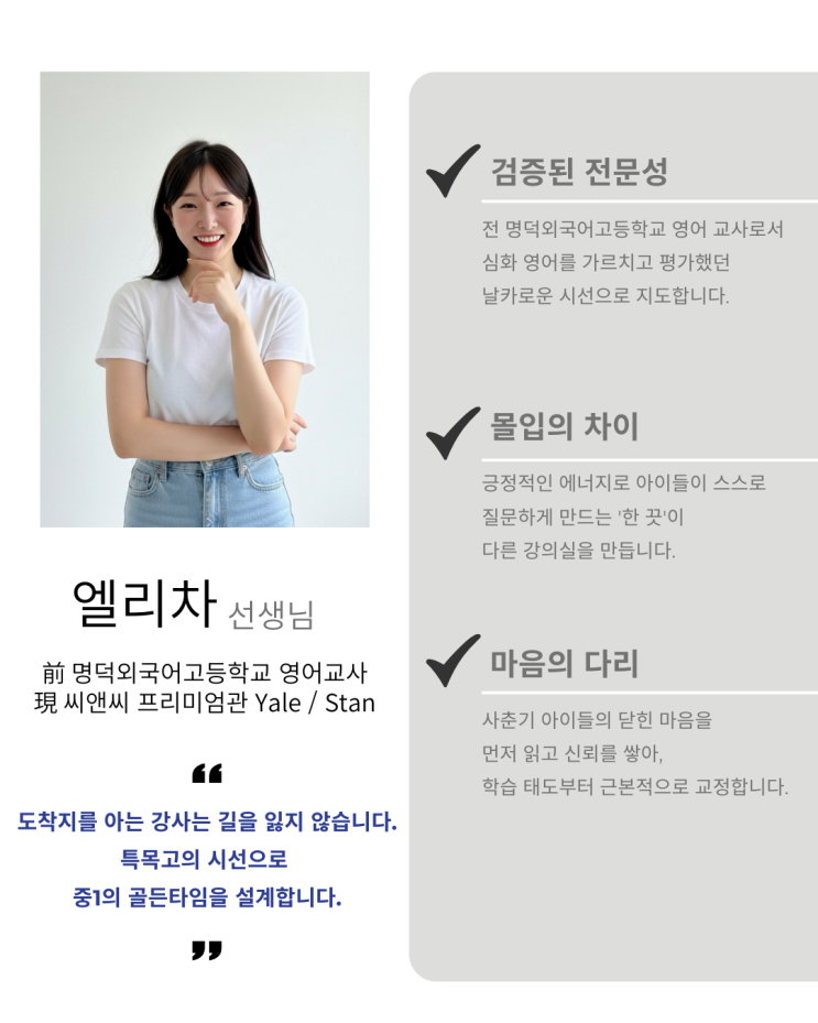 ☑️ 엘리차 선생님의 관명/담당 학년/반 씨앤씨 프리미엄관 중1 Stan/Yale ☑️ 엘리차 선생님의 경력 현) 씨앤씨 프리미엄관 중1 담임 전) 명덕외국어고등학교 영어 교사 ☑️ 엘리차 선생님의 교육 철학 "도착지를 아는 강사는 길을 잃지 않습니다. 특목고의 시선으로 중1의 골든타임을 설계합니다." "즐겁게 몰입하고, 지독하게 결과로 증명합니다." 단순히 지식을 주입하는 수업은 아이들을 변화시킬 수 없습니다. 긍정적인 에너지가 넘치는 강의실 안에서 아이들은 스스로 질문을 던지고 극한의 몰입을 경험합니다. 그 '한 끗'의 몰입 차이가 최상위권의 실력을 결정합니다. "영어 성적보다 먼저, 아이....... <img src="https://blogthumb.pstatic.net/MjAyNjAzMDRfMTA0/MDAxNzcyNjAyMTI2MzA3.ox3jNWpfotO-j6umI2lH0DRpIdZnwH4kXzqUnd1Nslgg.Ji9ntjo1PtdHPET6CAlHGAIsJTmKrdyoIc6kbV0CbGkg.PNG/%BF%A4%B8%AE%C2%F7_1.png?type=s3" />