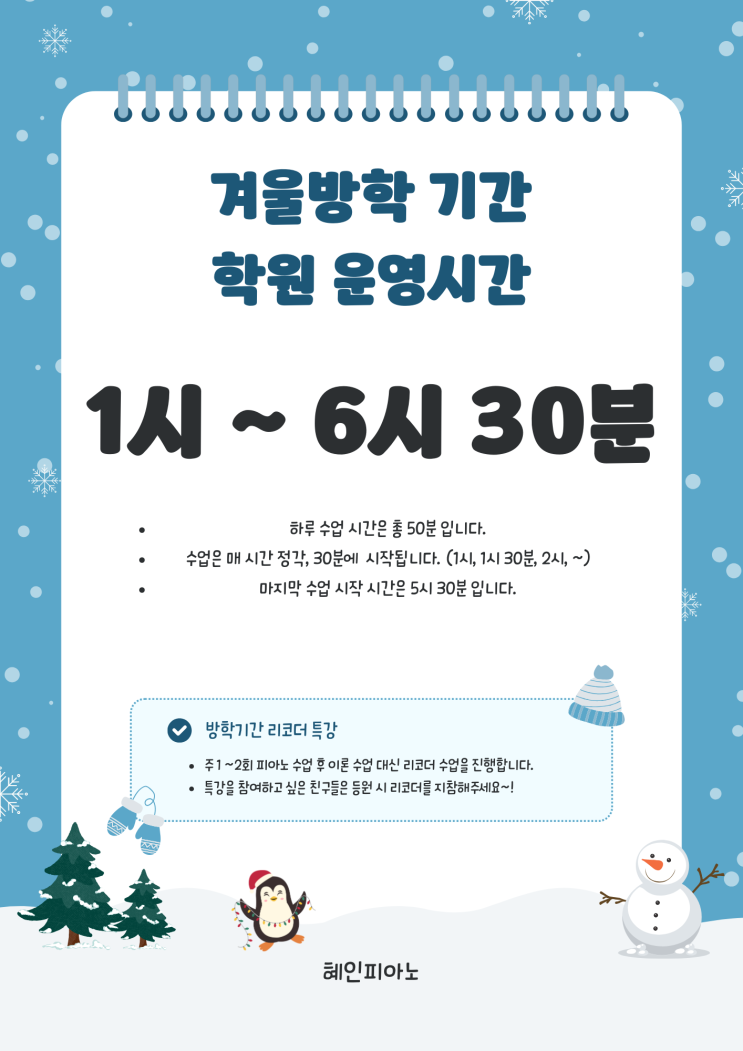 겨울방학 기간 학원 운영시간 | 여수 혜인피아노