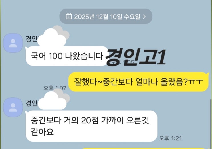 현재까지 조사된 1등급이 예상되는 학생들 성적입니다. 중세국어를 꼼꼼하게 외운 학생들에게는 어렵지 않은 시험이었지만 그렇지 않은 학생들 입장에선 까다로운 시험이었을 것으로 보입니다. 다음 주부터 모의고사 대비에 들어갑니다. 비문학 독해 방법을 시작으로 화작문까지 모든 영역을 2월말까지 마무리할 예정입니다! 26년 3월 18살의 봄이 꽃처럼 활짝 피길 소망합니다. #경인고국어학원 #구현고국어학원 #오류고국어학원 #고척고국어학원 #우신고국어학원 #구일고국어학원 #경인고기말고사 #구현고기말고사 #오류고기말고사 #고척고기말고사 #우신고기말고사 #구일고기말고사 #경인고국어 #구현고국어 #오류고국어 #고척고국어 #우신고....... <img src="https://blogthumb.pstatic.net/MjAyNTEyMTBfMTM0/MDAxNzY1MzUxMTkwMzQ0.BRBB_jwVSsMuHAVGp0DKeFu5FjoanubLY4YN1a3_GnMg.y5exVd-j3Bkpyj1RiGzESOiV4mWgSRyZ_xgxxsfOIXsg.JPEG/900%A3%DFScreenshot%A3%DF20251210%A3%DF132459%A3%DFKakaoTalk.jpg?type=s3" />