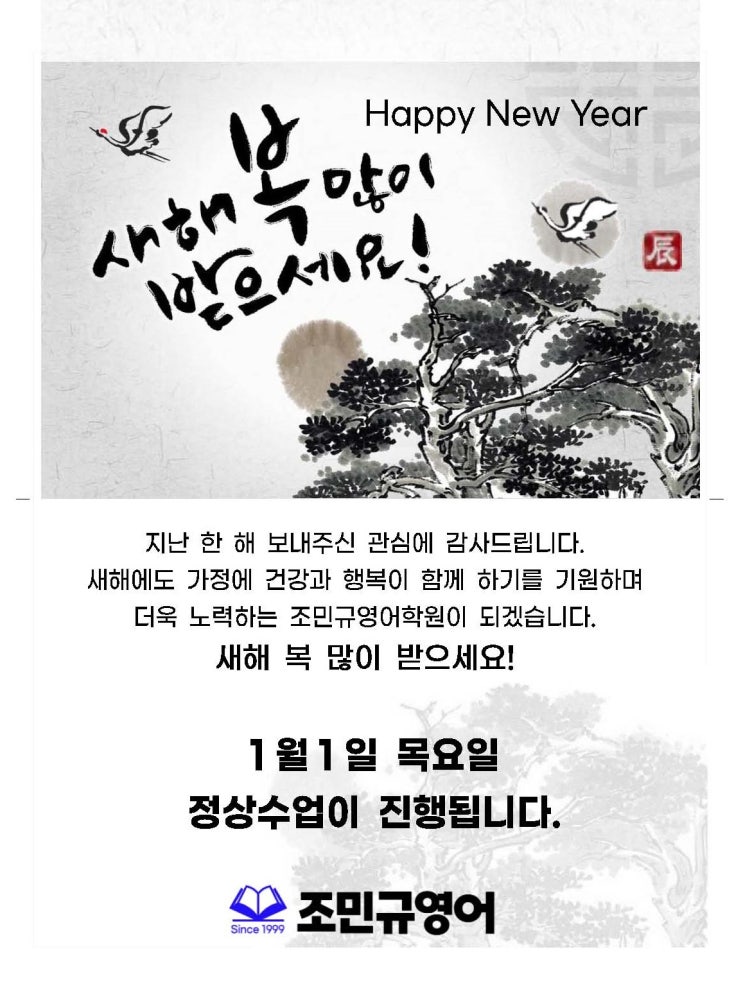 대치동영어학원, 조민규영어 : 2026년 1월1일 목요일은 정상수업이 진행됩니다.