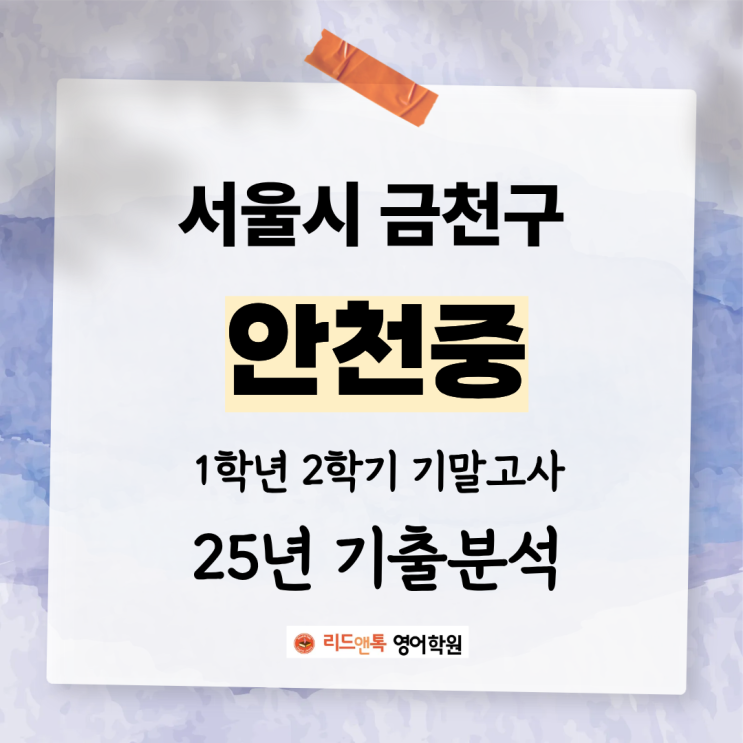 리드앤톡 금천독산점에서는 재학생의 90% 이상이 성취도 A(90점 이상) 를 달성했습니다. 이번 안천중 기말은 “외워서 푸는 영어”보다 읽고(이해) → 구조를 잡고(문법) → 근거로 선택하는(사고) 힘이 점수로 직결되는 시험이었습니다. 결론부터 말하면, 영어원서읽기로 독해 근육과 어휘·구문 감각을 꾸준히 만든 학생들은 내신도 흔들리지 않습니다. 그리고 원서읽기 없이 고등/수능 영어를 대비하기는 점점 더 어려워집니다. 1) 시험 총평 한 줄 요약 전체 난이도: 중~중상(상위권 변별형) 변별 포인트: 5점짜리 독해(정보일치/주제/문장삽입/답할 수 없는 질문) + to부정사/it/접속 표현(시간·양보) 같은 구문·문맥 판단형 2) 시험 구성 (문....... <img src="https://blogthumb.pstatic.net/MjAyNTEyMThfOTYg/MDAxNzY2MDI2MjExMTY0.LeSZ-iWxz8SKRtS2UOhrlbakpUnoeY6Jgt2sC8GgB90g._teag5P7Wn9uJunVBay6nj3-nmzN4-X5PvEVCbg61R0g.PNG/%BE%C8%C3%B5%C1%DF%B1%E2%C3%E2.png?type=s3" />