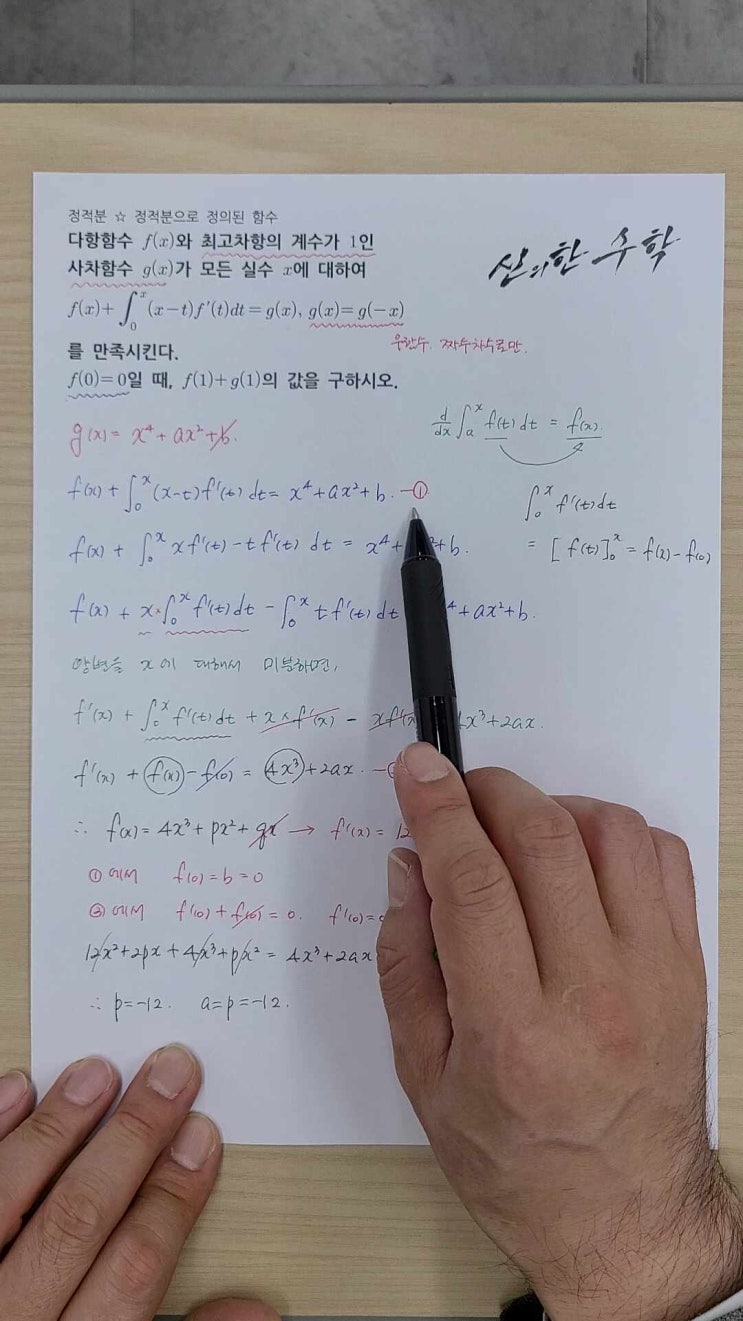 안녕하세요? 날씨는 추워도 마음은 따뜻한 하루를 보낸 신의한수학학원입니다. ^^ 오늘은 고등학교 2학년 미적분1 과목에서 적분 구간에 문자가 있을 때의 정적분을 해결하는 문제 풀이 3편입니다. 1번 식에서 양변의 x에 0을 대입하면 정적분의 성질에 의해 f(0)=b를 얻게 되는데, f(0)=0이라고 했으므로 b=0임을 알 수 있습니다. 또 2번 식에서 양변의 x에 0을 대입하면 f'(0)=0을 얻게 되는데, f'(0)=q이므로 q=0이라는 것을 알 수 있습니다. 그럼 이제 p의 값만 구하면 f(x)가 완성되겠네요~ ^^ 정적분 ☆ 정적분으로 정의된 함수 (3편) 지금까지 정리해 둔 f(x)와 f'(x)를 2번 식에 대입해서....... <img src="https://phinf.pstatic.net/image.nmv/blog_2026_01_28_3819/6RsuHfh2Xc_03.jpg?type=f480x480" />