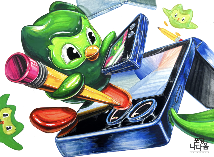 안녕하세요! 포항 나다움 미술학원입니다. 오늘은 듀오링고, 제트플립 수업에서 괜찮게 그린 우리 나다움 고1학생의 그림을 소개드리겠습니다. 일단 하도가 너무 귀엽고 재미있게 나와서 마음에 든 그림이에요. 제트플립의 꺾이는 모양을 타고 미끄러져 올라갔다 내려오는 생동감 있는 듀오링고의 모습과 포인트에서 한번 더 작게 스마트폰을 활용하고 어플리케이션 까지 그려줘서 각 제시물의 활용이 무척 좋아요. 그리고 캐릭터를 입체형으로 표현하고 평면형도 표현해서 다채롭고 스마트폰 측면의 버튼을 누르는 연출이나 연필을 보드처럼 타는 장난스러운 모습이 그림을 더욱 재미있게 해주고 있어요. 다만 채색에서 역광을 너무 밝게 했다거....... <img src="https://blogthumb.pstatic.net/MjAyNjAxMjNfMjMz/MDAxNzY5MTQ2Njk2NzAw.7xDaNA1y1fQvZA-8vm9t77Apl56QbtqV_3j7XA6YC18g.hDrTePP2V3NpOgEtzryxIK5rF4ZyFAww9lRj8UfbaM4g.PNG/%BD%BA%C5%A9%B8%B0%BC%A6_2026-01-23_%BF%C0%C8%C4_2.38.11.png?type=s3" />