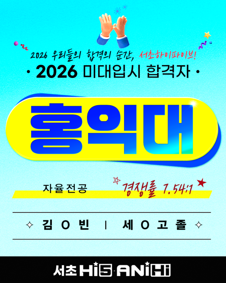 안녕하세요 디자인 전문 서초 하이파이브 미술 학원입니다! 바로 얼마 전이었죠..! 2026학년도 홍익대학교 정시 합격자 발표가 있었습니다!! 며칠 전 소개 드린 국민대 합격생 소식 기억하시나요? 바로 이 학생이 홍익대에도 지원을 했었더라죠 ▼ 국민대 합격 소식 보러 가기 2026 국민대 정시 합격 "미래융합전공의.. : 네이버블로그 모두가 함께 긴장된 마음으로 결과를 기다렸는데요.. 결과는 . . . 합격! 이번에 합격한 전형은 ✔ 정시 수능 100% ✔ 실기시험 없음 ✔ 무전공 입학(자율전공학부)인데요, 홍익대 자율전공은 입학 시 전공을 정하지 않고 입학한 뒤, 재학 중 전공을 선택하는 제도에요! 그래서 많은 학....... <img src="https://blogthumb.pstatic.net/MjAyNjAyMDJfNDMg/MDAxNzcwMDAzMzQ0NDcy.pC_kFm13Fjrapm07AoB7PHH5s9FzDnnzkdkWVDKjR_Qg.CuELGR3TbQfVnEbXCWt3xKMngyUmYC_pVSMnSMkmPNYg.PNG/IMG%A3%DF0709.PNG?type=s3" />