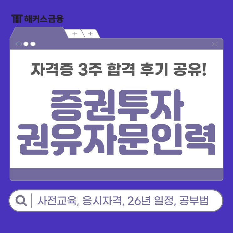 안녕하세요 여러분 :) 금융권 자격증을 알아보다 보면 비교적 단기간에 도전이 가능하고 활용도가 높은 자격증으로 증권투자권유자문인력이 자주 언급됩니다. 이번 글에서는 자격증을 처음 준비하는 분을 위해 증권투자권유자문인력 사전교육부터 26년 일정까지 기본 정보를 정리하고, 이어서 실제로 3주 만에 합격한 후기를 함께 소개해 보려고 해요. 빠르게 자격증을 완성하고 싶다면 이번 글이 준비 방향을 잡는 데 많은 도움이 될 것입니다! 2026년 시험 일정 2026년 자격시험 일정은 총 3회 시행될 예정입니다. 33회는 2월 8일 일요일에 시행되며 1월 12일 오늘부터 1월 16일까지 접수 기간이 시작되었어요. 해당 회차 합격자 발표는 2월 19....... <img src="https://blogthumb.pstatic.net/MjAyNjAxMTFfMjU2/MDAxNzY4MDk3ODM3OTAw.FTmc2tVN-jJAZOPa_e-1H_0RkdOJwuBygN73Nz0EcwEg.8oBmaXDcuJaf0CabGysOa3aR82SAf9LYrcvE6mv3jGcg.JPEG/%C1%F5%B1%C7%C5%F5%C0%DA%B1%C7%C0%AF%C0%DA%B9%AE%C0%CE%B7%C2_%BB%E7%C0%FC%B1%B3%C0%B0_1.jpg?type=s3" />