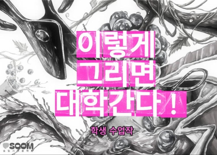 안녕하세요! 디자인 숨 미술학원 입니다! 오늘은 포도, 가위, 종이컵을 소재를 그린 수업작을 가져왔습니다! 주제 이해 → 형태 해석 → 화면 설계 → 밀도 조절까지 단계별로 고민하며 쌓아가는 과정이 중심이 되었고 완성도만 보여주기보다는 어떤 사고를 거쳐 이 화면이 만들어졌는지에 초점을 두었습니다. 입시는 결과로 평가받지만 그 결과를 만드는 힘은 결국 이렇게 반복된 수업의 밀도에서 나옵니다. 다음 포스팅에서는 또 다른 학생 수업작으로 돌아오겠습니다! <img src="https://blogthumb.pstatic.net/MjAyNjAxMjJfMjM0/MDAxNzY5MDUyMDk0Nzkz.I8t5mvIodYgWNE0M-xqygDLdPk8zwjnonbeReQZesc8g.5CUmAjxfwQMwydgkVmcemgPLzNJLvUOQJd2VEf2GH_wg.JPEG/0120%282%29-Cover.jpg?type=s3" />