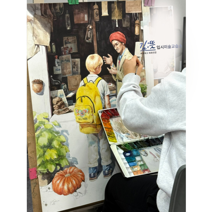 겨울특강의 마지막 주입니다. 4주가 어떻게 지나갔나 싶은데 이젠 아이들과 시간이 아쉽다는 이야기를 하게되네요. 학과도 실기도 바쁜 요즘, 즐겁게 그린 예비고3의 수업과정을 보여드립니다. . 주제는 노란배낭을 맨 소년이 호기심어린 눈으로 가게주인과 대화를 나누며 무언가를 찾고 있으며 이건 희망과 꿈에 대한 기대 같습니다. 새해의 소망과 의지가 느껴지는 기분 좋은 작품이 완성되었네요. . 마무리까지 꼼꼼하게 완성하는 끈기가 올 해의 첫 수확이네요. 김:뜻의 그림이 궁금하시다면... 노란배낭의 소년의 호기심, 새해의 희망 수업문의 010.2722.6010 (문의및 예약문자 남겨주시면 확인 후 연락드리겠습니다. ) (상담 시 주차지원가....... <img src="https://blogthumb.pstatic.net/MjAyNjAxMjZfNjcg/MDAxNzY5NDI4MDcwNDE3.iWeSVzIaIvV895pENZL0Wwbja1B-MupXaSegtdrkxGsg.2f7AytT9paLSggyPnK2BJYPHY1mcxBayAXzsZrmB5Ngg.JPEG/Untitled-design-001_-_2026-01-26T204524.549.jpg?type=s3" />