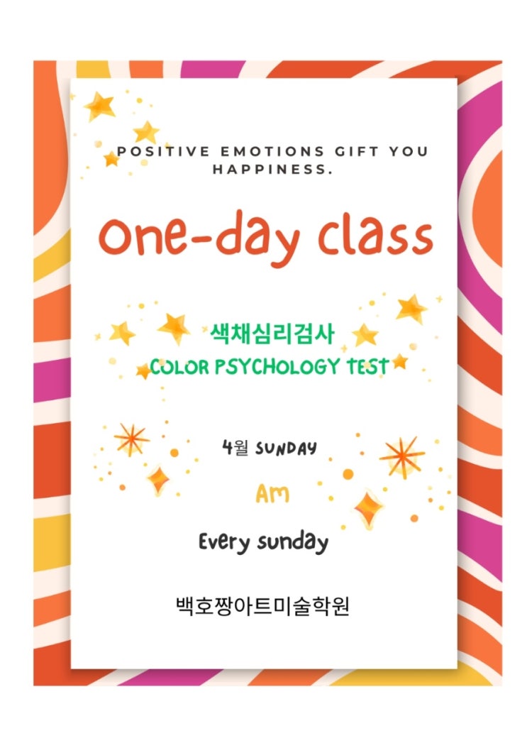안녕하세요, 백호짱아트미술학원입니다. 이번에 중·고등학생을 대상으로 **“컬러로 알아보는 감정·자기이해 프로그램”**을 진행합니다. 중고생 어머니들께서 계속 기다리시고 원하시는 수업이 드디어 준비하였습니다. 중·고등학생 대상 색채심리 수업 4월달매주 (일요일진행)) 예약필수입니다. 비용:13만원 부모상담 비용은 따로 진행됩니다. 4월 첫째주5일(10명모두예약완료) (집단/개인)모두 가능합니다. 이 수업은 단순한 미술활동이 아닌 색채심리를 기반으로 아이의 감정 상태와 성향을 자연스럽게 이해하고 자기표현 능력을 키워주는 프로그램입니다. 1.현재 감정 상태 파악 2.스트레스 표현 및 해소 3.자기이해 및 자존감 향상 수업 후....... <img src="https://blogthumb.pstatic.net/MjAyNjA0MDNfMjQw/MDAxNzc1MTk4NzY3OTg4.ro56jlf16k2a5rYzkiKmgw_ezD8i4VkE3KFbnZ-iQ_Ag.1vWwx4REM_mMZ95_oqv6ZAkwkrEp4acvPFg-5fu7KfUg.JPEG/900%A3%DF1775198728418.jpg?type=s3" />