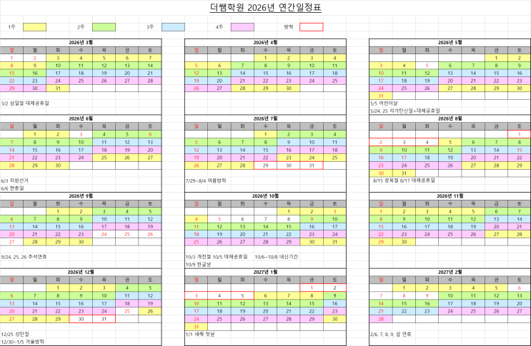 더쌤 중고등학원 중등수학과학, 고등수학과학학원 연간일정표