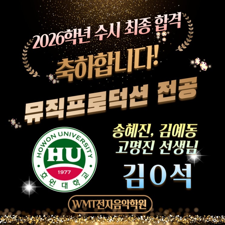 2026학년도 입시에서도 WMT전자음악학원 학생들이 의미 있는 결과를 만들어내고 있습니다. 이번 소식은 호원대학교 뮤직프로덕션 전공 ‘수시 최종 합격’입니다. 김○석 학생, 진심으로 축하드립니다. (지도: 송혜진·김예동·고명진 선생님) 이번 합격은 무엇보다 팀티칭(Team Teaching) 방식이 강점으로 작동한 사례입니다. 뮤직프로덕션 전공은 단순히 “곡이 좋다”가 아니라, 작품 전체에서 설계·완성도·전형 적합성이 동시에 입증되어야 합니다. WMT는 이 세 가지를 분리해서 보는 것이 아니라, 하나의 결과물 안에서 통합적으로 완성하도록 지도합니다. ✅ 호원대학교 뮤직프로덕션 전공 합격의 핵심: “작품을 프로덕션 관점으로 완....... <img src="https://blogthumb.pstatic.net/MjAyNjAzMDJfMTQ4/MDAxNzcyNDQxNDQ5NDI4.HPydLcHYLrJ8d95V9wwqwJtwbFYKxtpSdj-9MpwhQT8g._GvON0yXLwfmDdOSRnY33jzEqRcmfXq9tm3Q9fIblMYg.JPEG/573531016_18086891732494554_1626388357893657215_n.jpg?type=s3" />