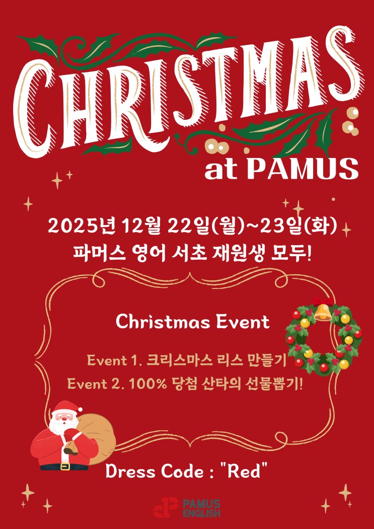 안녕하세요 파머스 영어 서초캠퍼스입니다^^ 다가오는 크리스마스를 맞이하여 파머스 영어학원에서도 크리스마스 파티를 진행합니다! 올해 크리스마스 이벤트는 더욱 풍성한 구성으로 준비하였습니다 ~! 직접 크리스마스 리스 만들기와 산타가 준비한 선물 뽑기까지 !!! ★ 날짜: 12월 22일 (월), 12월 23일 (화) ★ 드레스 코드: 레드 컬러 의상이나 소품 드레스 코드 같은 경우에는 부담이 되지 않는 선에서 착용해 주시면 감사하겠습니다 ^^ <img src="https://blogthumb.pstatic.net/MjAyNTEyMTlfMjg5/MDAxNzY2MTIxMDI1Mjg2.sNuNiVV4qB182mYKLDKh-To-bEjzzKkDoHSs9dwL7u8g.2xDqzp_YMgUhaLi6xx7nk13_3eIBJO_g3--A6S4Egwcg.JPEG/2025_Christmas2.jpg?type=s3" />