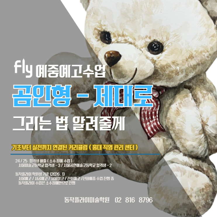 LET'S FLY WITH FLY 안녕하세요!! 동작 플라이 미술 학원입니다 이번 그림은 곰인형 입니다 "곰인형" 예중, 예고 미대입시 정물 개체 수채화 '곰인형 평가 기준에 맞춘' 단계별 설명을 소개합니다 예중, 예고 미대입시에서 자주 나오는 정물 중 하나입니다 아이들이에게 가끔 선물로 사기도 하는 곰인형~ ^^ 입시미술에서는 중요한 정물 소재 중 하나라는 것!!!! 겉모습은 단순하지만, 그만큼 관찰력과 입체 이해력이 그래로 드러나는 소재라 연습 효과도 클 수 있어요 곰인형은 단순히 귀여운 소재가 아니라 형태 이해, 명암 구조, 질감 표현 능력을 동시에 평가할 수 있는 대표적인 개체 정물입니다 전체 형태의 특징....... <img src="https://blogthumb.pstatic.net/MjAyNjAxMjVfMjQ4/MDAxNzY5MzA1OTQ4OTc4.AJxFGyiMTmxFkXfEVDPLMDhoNinMnSyyLLM4GSFt82Ig.813yA3rEhNQ7xiAJ0QixVYBBaZFSDErLU8HnATA4Uucg.PNG/%B0%F5%C0%CE%C7%FC%C2%A1.png?type=s3" />