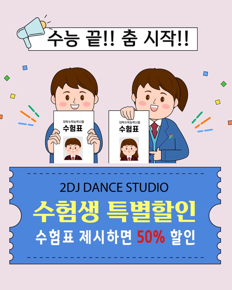 2DJ DANCE STUDIO 수험생 특별 할인 이벤트 안녕하세요, 투디제이댄스학원입니다! 먼저, 올해 수능 보느라 정말 고생 많았어요. 그동안 책상 앞에서 버티느라 눌러놨던 흥과 끼, 이제 마음껏 터뜨릴 시간이죠? 그래서 저희 2DJ DANCE STUDIO에서 수험생들을 위한 특별 이벤트를 준비했습니다! 수험표만 보여주면 수강료 50% 할인! 수험생이라면 누구나, 수험표만 제시하면 바로 반값 할인이 적용됩니다! ✔ 케이팝 ✔ 걸스코레오 ✔ 걸스 비기너반 ✔ 비기너반 ✔ 중급반 ✔️보이그룹 케이팝 원하는 장르 마음껏 골라서 즐기세요! “춤은 처음인데요…?” 걱정은 NO! 처음 춤추는 친구도 부담 없게 레벨별로 나뉜 커리큘럼이라 바....... <img src="https://blogthumb.pstatic.net/MjAyNTExMTRfODIg/MDAxNzYzMDc3NTMzMTE1.9BoG2vTBd0tFXfpU0vCAn0nbE37smmdb98zR_I2RblYg.tRGQFbePl8mVm4pyUWPTxZBLnEyOZgGBYhvDhqLJlhsg.JPEG/2025_%BC%F6%B4%C9.jpg?type=s3" />