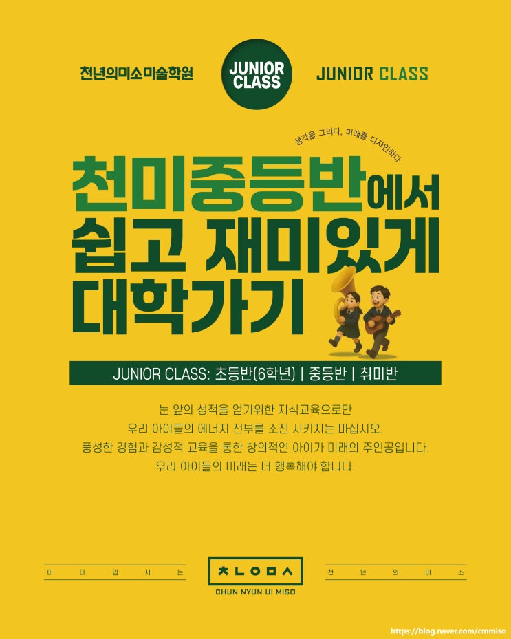 안녕하세요. 천년의미소 미술학원입니다. 중학생이 되면 미술을 시작하고 싶어 하거나, 초등 미술에서 조금 더 전문적인 단계로 넘어가고 싶어하는 학생들이 참 많습니다. 하지만 학부모님들은 이런 고민을 많이들 하시죠. 너무 입시 위주라 아이가 지치진 않을까요? / 아직 기초기 부족한데 잘 따라갈 수 있을까요? 그래서 천년의미소 미술학원 중등반(JONIOR CLASS)은 획일화된 수업이 아닌 학생 개인별 맞춤 수업을 지향합니다. 우리 아이가 미술에 흥미를 잃지 않으면서도 탄탄한 실기력을 쌓을 수 있는 체계적인 커리큘럼을 소개합니다. 천년의미소 미술학원 중등반 / 취미반 눈 앞의 성적을 얻기위한 지식교육으로만 우리 아이들의 에너지....... <img src="https://blogthumb.pstatic.net/MjAyNTExMjVfMTUg/MDAxNzY0MDU0MjExMTcz.lxRS8Nh4Ii8rMPgVq8orSI0A1p80IeI1iw8b_RbWqXgg.3i6snbUMG8nyiE0UXK-L5UFFRo1jYCmfH7kr_BTKQWUg.JPEG/2510%BC%AD%C3%CA_%C4%BF%B8%AE%C5%A7%B7%B3_%C1%DF%B5%EE%B9%DD_01.jpg?type=s3" />