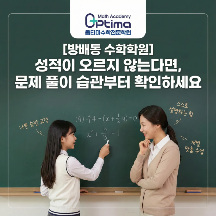 방배동수학학원 성적이 오르지 않는다면, 문제 풀이 습관부터 확인하세요 열심히 학원을 다니는데도 성적이 제자리라면 아이가 공부하는 방식(특히 나쁜 연습 습관)을 가지고 있는 것은 아닌지 점검해봐야 합니다. 방배동 수학학원 옵티마수학은! 1. 감으로 풀지 않습니다, 논리적인 과정을 씁니다 많은 학생들이 문제를 읽고 감이나 직관에 의존해 답을 찍어내는 나쁜 습관을 가지고 있습니다. 이렇게 공부하면 쉬운 문제는 맞출 수 있어도, 조금만 복잡해지면 손을 대지 못합니다. 저희는 아이들이 논리적으로 식을 세우고 푸는 연습을 끊임없이 시킵니다. 답이 맞았더라도 풀이 과정이 논리적이지 않다면 다시 점검합니다. 머릿속에 엉켜 있는....... <img src="https://blogthumb.pstatic.net/MjAyNTEyMDVfNjMg/MDAxNzY0OTIxNzM3ODgx.NFaiFotsIr-uZeNMhwCUxRoaS3-soICl3M20bxDIVBIg.DvCmzjOh9gZAV5le0y8eBY1J7KuGDSZPjgT0Ia_csmIg.PNG/%C1%A6%B8%F1%C0%BB_%C0%D4%B7%C2%C7%D8%C1%D6%BC%BC%BF%E4..png?type=s3" />